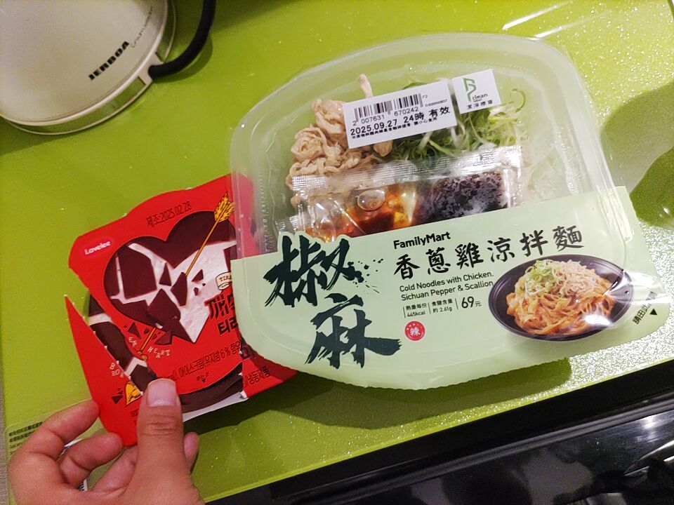 自分はこの何かの麺とアイスを買いました!あとは水も!〈香蔥雞涼拌麵 69元〉〈BROKEN HEART TIRAMISU CUP 値段不明〉〈水 29元〉